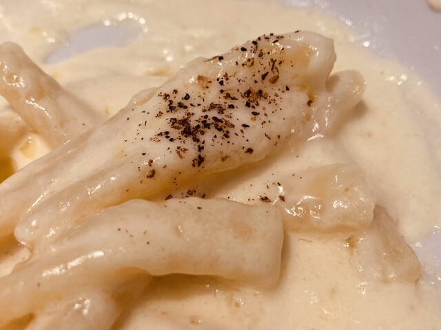 見た目も味わいもライブも接客もどれも素晴らしかったのですが、私は特にセミハードタイプのモンタージオチーズがめちゃくちゃお気に入りで、ショートパスタとの相性が抜群でした。熟成度によって風味が異なり、料理に削り入れたり、ソースに溶け込ませたりすることで、様々な味わいを楽しむことができるのですが、ライブパフォーマンスが良かったです。 リピート決まりです。