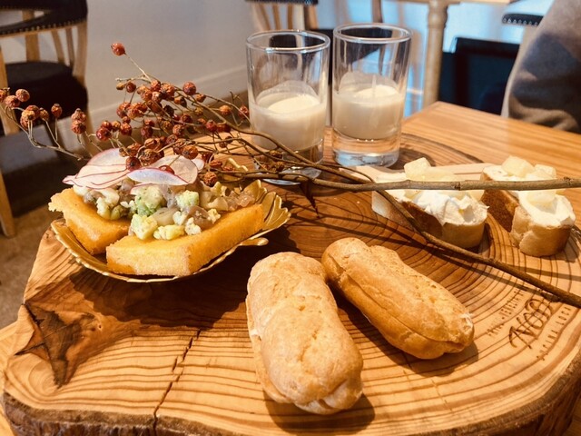 前菜4品盛り合わせ:カツオとロマネスコのタルタル ポレンタ添え、洋梨とマスカルポーネチーズのブルスケッタ、紅はるかのスープ、生ハムムースのエクレア、