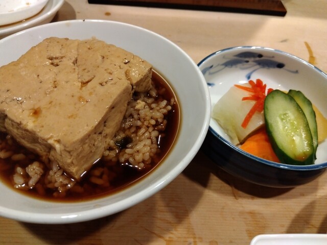 出汁だしが多くって 白米がどっぷり浸かってます、上には豆腐がどどーんた鎮座