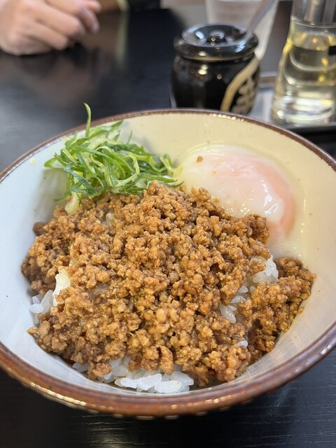 今回はつけそばに肉そぼろご飯(温泉卵付き)を頼んだ。