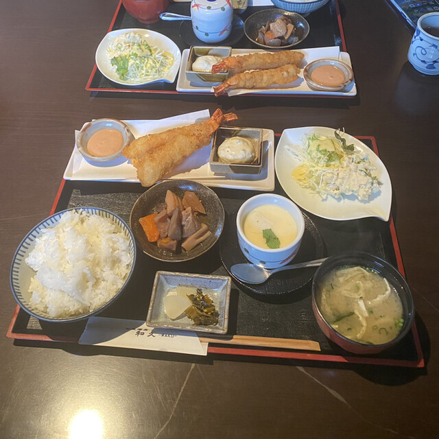 7、8分で配膳です 茶碗蒸しは後からお持ちしますとの事でしたので早速頂きます立派なエビフライが2本 小鉢は高野豆腐と青菜の炊き合わせサラダ2種盛り お味噌汁