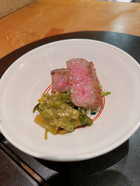 焼き具合も良く旨味ある宮崎牛を山葵菜と共に〜