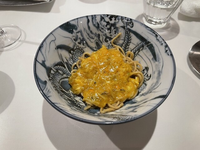 今回特に印象に残った料理は〆の上海蟹の身をほぐしてあんにして掛けた汁無し麺が感動レベルだった。