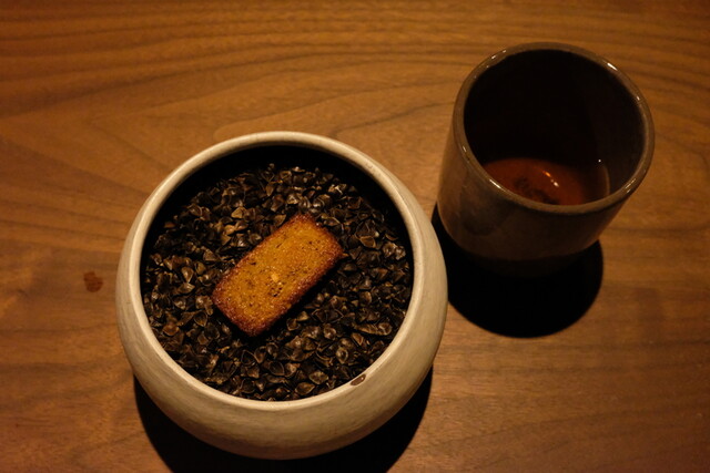 続いて出されるフィンガーフードも桃とサクラマスとビーツを使ったもの、野沢菜と馬肉のおやき、味噌とブルーベリーのフォアグラ