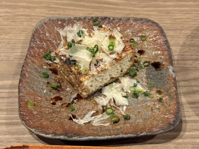 栃尾揚げにかかっているふわふわの鶏節がカリッとアツアツな厚揚げに合いとても美味しい
