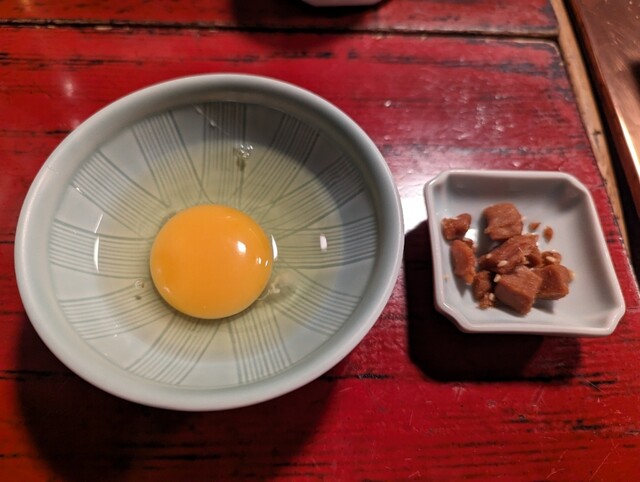 鉄鍋でグツグツと煮立った、味のしみた具材たちを卵につけていただきます。