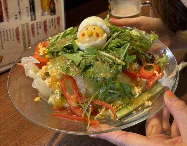 帰省した際に予約して訪問しました。4000円の飲み放題のコースです。食べきれない量が出てくるとの情報がありましたが、まさにその通り!その日のメニューは茶碗蒸し、サラダ(画像あり)、刺し盛り(画像あり)、オードブル(画像あり)、鶏肉のニンニクソース、鮭カレー炒飯(画像あり)、デザート(画像あり)。サラダはひよこが乗っている可愛さ笑、卵ドレッシングとも言えるトッピングで普通のサラダが美味しく頂けました。注目は刺し盛り!通常の3倍はあろうかという厚みで満足度高いです!オードブルの白身のカマ焼きは明らかに新鮮であることが分かります、うん、うん。特筆すべきはインゲンの天ぷら!東京で出回るそれとは種類が違うのか、柔らかい!鮭カレー炒飯はニンニクが効いていて、体重1キロ増決定の完食笑(画像は取り分け後のため少なく見えますが)。デザートはフワフワのパンにアイスクリーム、生フレンチトーストのような、、美味しい!もう何も入らない!満足です!評価の0.5のマイナスは鶏肉のニンニクソースが他のメニューと格差ありでした。帰りにペットボトルのお水も頂けて最高の夕食でした、コスパも最高ー!また来たい!