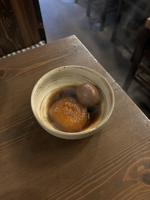インスタに開店のお知らせがあり、日曜日の16時に妻と利用しました。既に中には2組の客が、16時オープンなのだが笑 インスタ画面表示でドリンク1杯無料で乾杯(今やっているかは?)。牛すじ黒、牛もつ白、煮物の卵と大根、茹でピーナッツ、牛タン厚切り、あとでぼっかけ(牛すじ黒)のせ焼きそばをオーダー。わたしの飲み物はハイボール、ホッピーの白(中追加)。妻はレモンハイボール。焼きそばのぼっかけは、ほぼ牛すじ黒の一人前なので焼きそば頼めば牛すじ黒はいらないかも。全部美味しいです!好みとしては牛もつ白かな。煮込み過ぎずもつぷりぷり^_^ 焼きそばは紅生姜天とマヨネーズが乗っててこれまたいい感じ。ドリンク1杯無料が功を奏して2人で6000円、回転も早く、さっと飲むのもいいかも。ご馳走さまでした、満足でした^_^