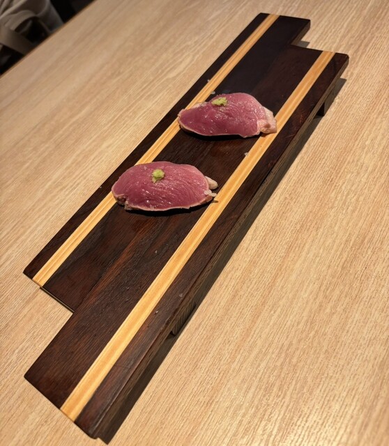 鴨肉の2種盛り合わせはロースとももの生ハムの厚切りみたいな感じです。ももはネギを巻いています(背負ってはいません)。スターターとして丁度いいです。美味しいです。