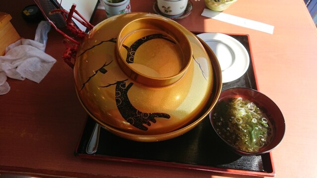 王様らしく、黄金の大どんぶり蓋付き・青さ味噌汁・ひじきの小出しがプレートに載って・・・・