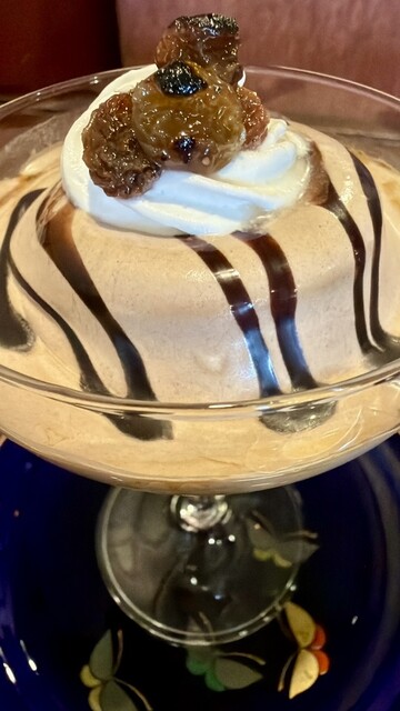 ラミープリンは自家製プリンにチョコホイップと貴腐ワインラムレーズンが乗ったこだわりスイーツ