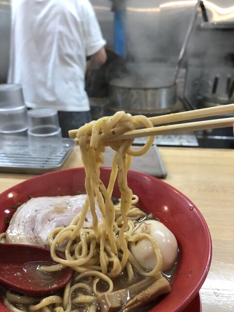 剛麺と言って差し支え無かろうな、相変わらずの太麺。今回は若干強張りを感じたが、やはりこの麺だからこそこのスープに負けずに渡り合えるのだ!