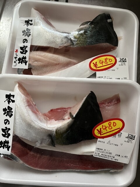 年末に予約していたお寿司を受け取りに杜の市場に行きました。道路も駐車場もいっぱい。「あまりお正月って気がしないねー」と言っていましたが、杜の市場に近づくにつれ増してくる慌ただしさ。市場に入ると、一気に盛り上がってしまいました。一気に正月が来たああー!という感じです。市場内を歩けないほど、レジや品物に人が並んでます。目当ての店はどこだろうな?と歩いていると、通りすがりに目に飛び込んできたのが見事な寒ぶりのカマ!焼いただけで美味いやつ。それが驚きの価格。お値段は画像を見てくださいな。レジもちょっと人が少なめ。これは絶対に買わないといけないやつね。ひとつパックをつかみ、並び、また戻ってもう1パックつかみ、並び直しました、嬉。おでん用のウインナー巻きも購入。おでんを仕込むのが楽しみですよ。その日の夜さっそくぶりカマを焼いて食べました。脂がのって甘い♪美味い♪小躍りしたくなるような気分で晩酌しました。すんごい良い買い物をしたと思います。時々、杜の市場にも足を運ばなきゃいけないなーと反省した2024年最終日でした。チャンチャン!