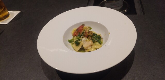 南イタリアプーリア州の定番料理。モチッとした自家製オレキエッテと菜の花の組み合わせ、それに北海道から届いたフレッシュな北寄貝。貝の旨味たっぷりのスープに菜の花のほろ苦さが春を感じさせる一皿です。ユースケさんのお手製オレキエッテの食感も茹で上がりも最高でした。