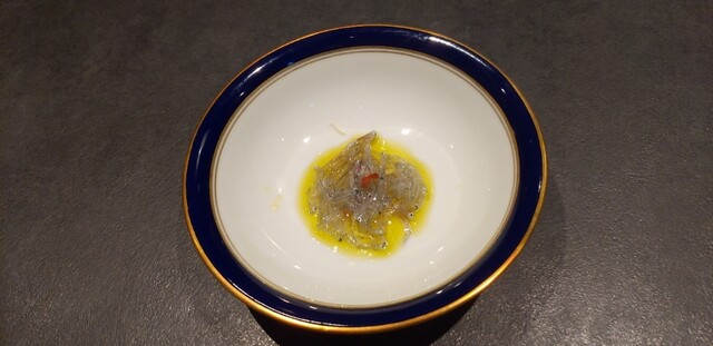 長崎の甘鯛は、鱗を立たせて、さっくりと揚げて。甘鯛の骨からとったお出汁に長崎の天然岩海苔(手摘み)、サフランを加えたスープを合わせて。