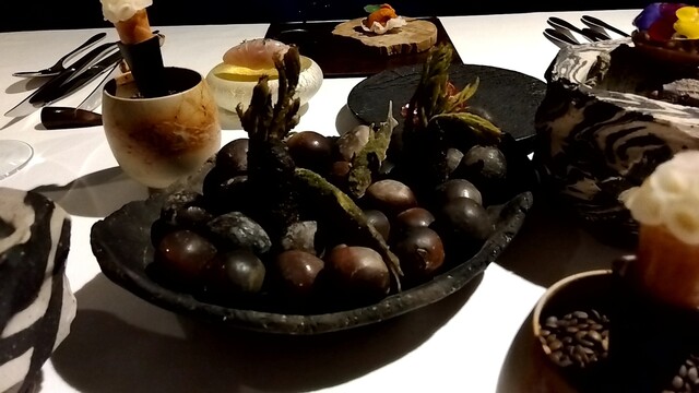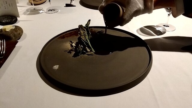 ボルドーの甘く苦味のあるホワイトアスパラガスは、バターでグリエ、炭火で焼いた富山ホタルイカを合わせ、ホワイトアスパラガスのピュレ、間にはクスクス、ローストしたアーモンド、マイクロセロリ、カラスノエンドウ、大根の花、あそ山のハードチーズを削って、玉ねぎのパウダーを散らして。