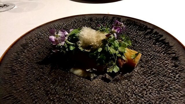トンカ豆のクッキーで挟んだのは冷製フォアグラのテリーヌ、りんご“王林”、柚子のピュレ、花“アリッサム”。ピーカンナッツのクロッカン。下にはローストした胡麻のようなアマニ。