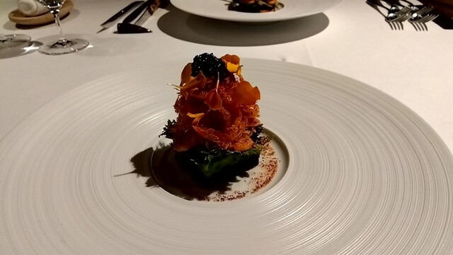 解禁した駿河湾の桜海老を使ったサラダ仕立て。下には黒米、うすい豆のピュレ、わさび菜、からし菜。その上には、富山の白海老を詰めて、ケイパー、ピクルス、木の芽、ゆで卵のグリビッシュソース。さらに上には、キャビア、マリーゴールドの花、桜海老とビネガー、フランボワーズのパウダー。