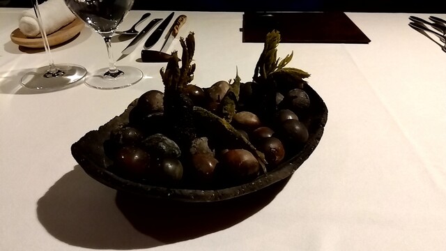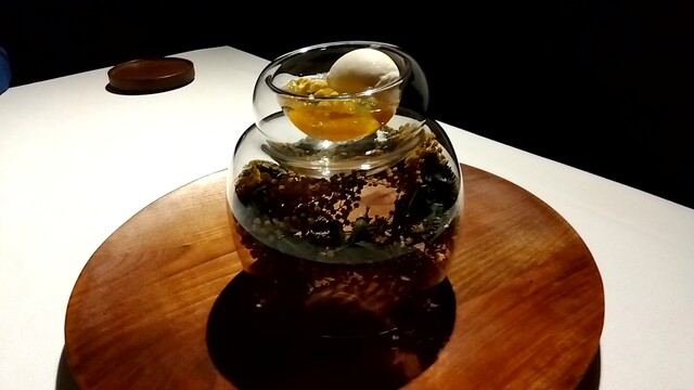 長崎産のどぐろ“べにひとみ”はフライパンでカリッとポアレ。蛤のお出汁を煮詰めた出汁に浜名湖の生海苔、絞ったライムを合わせたソース。ガルニには、菊芋のピュレ、行者にんにく、京都大原のたけのこ、奈良の花山椒、クレソン。山菜のパウダー(行者にんにく,コシアブラ、こごみなど)。