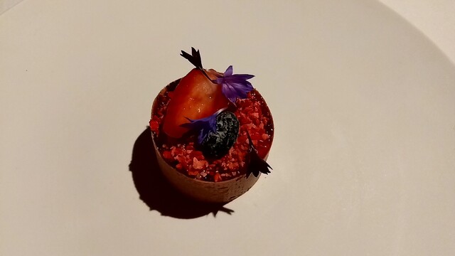 愛西市久保農園さんのいちごをシェリービネガーでマリネ、矢車草をあしらい、丹波の黒豆“しぼり豆”、フレッシュないちごを添えて、ドライいちごのパウダー。下にはルバーブのコンフィチュール、ハイビスカス、ヘーゼルナッツのムース。この全ての周りに、薄いいちごのクッキーで巻いて(囲って)。