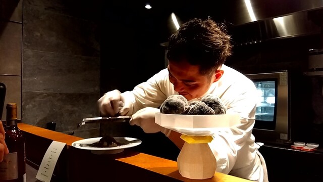 冷凍した黒トリュフが登場。冷凍黒トリュフをバニラアイスクリームの上に削って。黒雪のように積もります。口の中で溶けることでトリュフの香りが広がります。