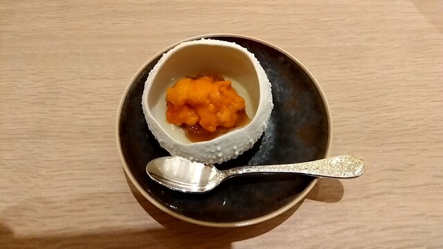 ホワイトアスパラガスのピュレの上に、雲丹をぽってりと。バルサミコソースを合わせて。