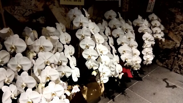 入口に、並んだ豪華な胡蝶蘭。ラペの松本シェフ、ア・ニュの下野シェフ、etcずらり。