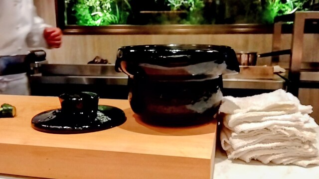 三國シェフは、お肉料理にご飯を合わせるのがお好きだそうで、一流の和食の料理人も使われる土鍋、信楽の雲井窯で炊いたご飯も一緒に。