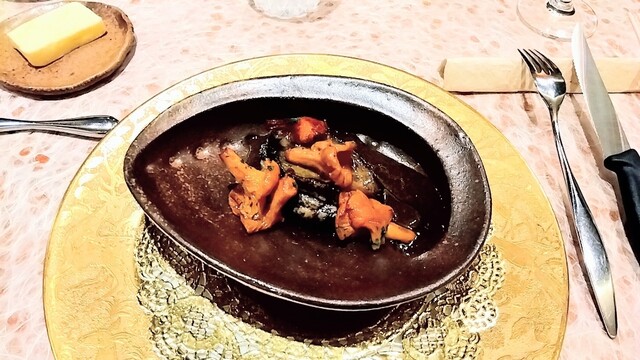 パイで包んだことによる絶妙な蒸し加減のアワビのステーキにアワビの肝ソース 、ジロール茸のソテーを合わせて。