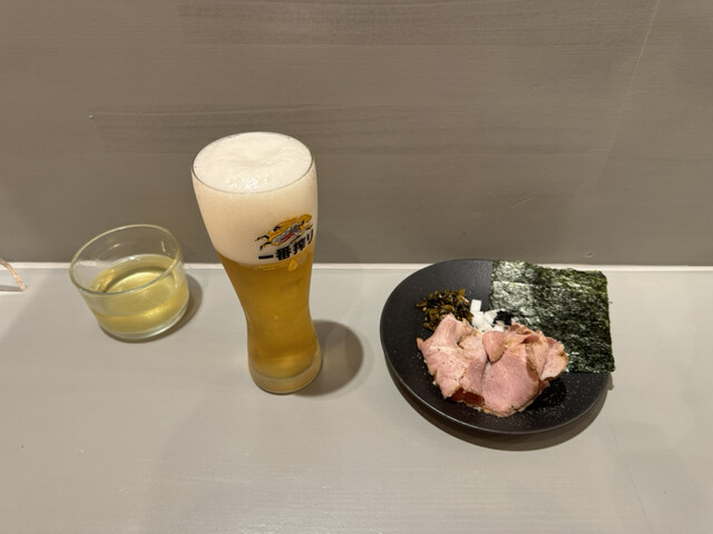 まずは、生ビールを注文。ビールと共に運ばれてきたのは、チャーシューと海苔など。