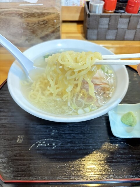 魚貝ベースの淡麗な塩スープと麺のハーモニーが絶妙。うま〜い そこにトッピングのわさびをといていくと優しいスープにわさびツーンとした辛味が加わりさっぱりとした味わいに変化。