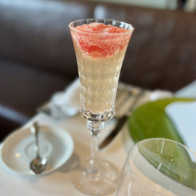 アミューズ 魚アラの裏漉しスープ、何かのジュレ寄せw