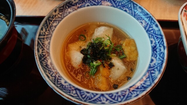 揚げ餅と粟麩のみぞれあんかけ 葱 もみ海苔 一味