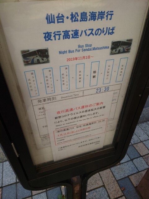 ホテル前のバス停:成田空港行バスは早朝1便(柏駅5:30発)のみで、逆方向(成田空港⇒柏)は運休中でゼロ