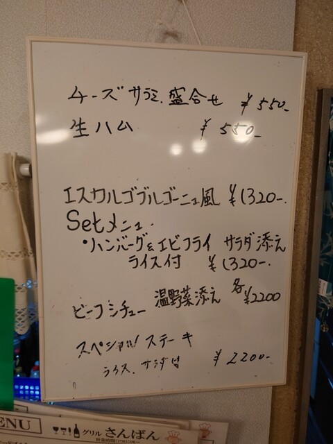店内の白板に手書きのスペシャルステーキは外国産牛で、基本は毎日あるそうです。
