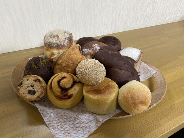梅カカオブラウニー、3色お豆ぱん、ショコラミルフィーユ、玉ねぎとじゃが芋クランブルスコーン、甘酒のお山ぱん、金柑と杏、カカオクロワッサン、苺酵母とピスタチオのツォップ、カカオと黒ビールのクグロフ、この9個だけ屋根(^_^;)