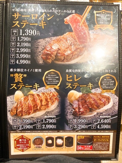 贅ステーキ、たしか注文したのは150gだったと思います。メニューには『希少部位カイノミ』と書いてありました。