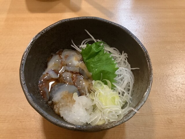 期間限定でネタが倍になっている「本まぐろざんまい寿司4貫」¥1319(本まぐろ、中とろ、大とろ、ねぎとろ) とおすすめメニューの「赤なまこポン酢」¥549を注文しました。このほかにお通し代がかかります。この日のお通しはマカロニサラダでした。
