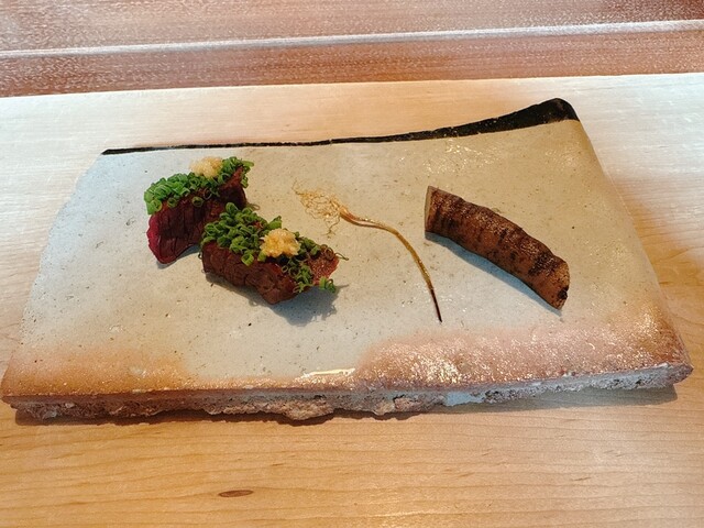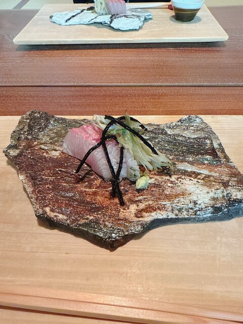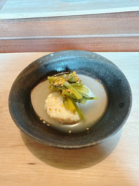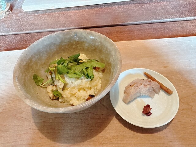 一品目はシンプルな焼き浸しですが、これが美味しい。出汁に僅かな甘味を加え、シャキシャキの白菜と旨味のあるスミイカは想像を遥かに超えて来ます。お椀は蕎麦がきが美味しく、牡蠣の旨味、きのこの味の濃さに加えていますが、かぼすの酸味で後味スッキリです。鮑は合わせる椎茸のそぼろが美味く合わせて別物の美味しさでした。ヒラマサは香味野菜と甘く煮た生ひじきを一緒に頂く事で、和風カルパッチョなります。根ボッケは雑味がなく、ノドグロを凌駕する味わいです。一転カマスはほぼイタリアンでドライトマトの甘味と旨みがカマスと良くあっていました。酸味の強い出汁で北寄貝の甘味を更に引き出した後は、最高の鰤大根。出汁は美味しく飲め、鰤にはインパクトのある塩味を纏わせるなど、食べた事の無い味わいです。旨味の強いキノコに出汁の美味しさが光きのこの炊き込みご飯が締めです。