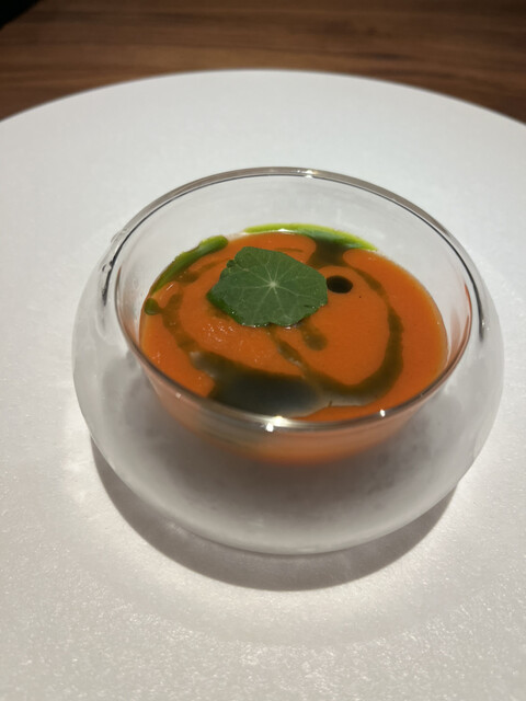 ビジネスディナーで伺いました。初見です。最近オープンされたそう。オーナーは以前は有名店に見えたそうです。奥様はパティシエさん。カウンターのみで、オープンキッチンでお料理されているところを拝見できて楽しいです。18:00一斉スタートで、満席です。お料理は、どれも繊細で、工夫がなされ、見た目も良くてとても美味しいです。最初のフォアグラの小品はくどくなく、良い甘さです。オマール海老も尻尾の部分と爪に部分で風味を変えて素晴らしい。そのた、ガスパッチョはさっぱりと、サザエのフライもサクサク、お肉はジューシーですね。パンは焼きたて、デザートまで美味しく頂きました。ワインペアリングは8杯で11000円と値打ちと思います。また伺います。ご馳走様でした。