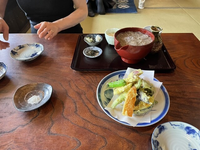 お店の名前の通りの合掌造りの店内で寛ぎながらいただくお蕎麦は最高でした。注文したのはもちろんお品書きの最上段にある十割蕎麦。また、天麩羅は新鮮な地元野菜が盛り合わされ、ボリュームも十分です。
