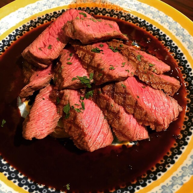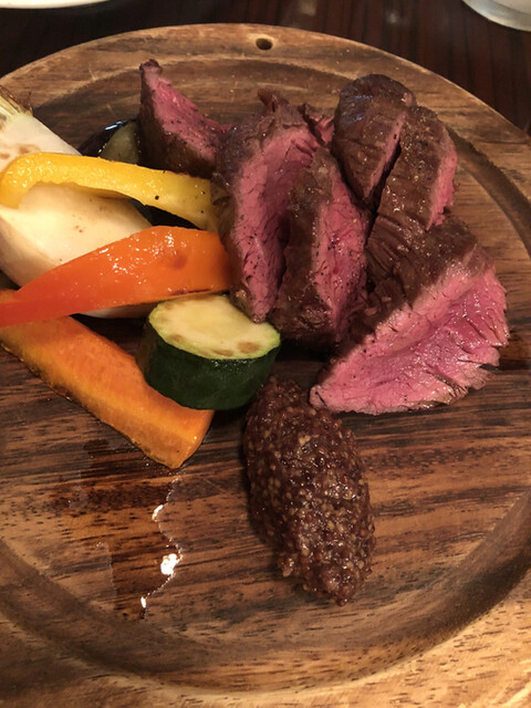メインは国産牛イチボのグリル、特製マスタードソース添え。上田シェフが研いだというナイフの切れ味がヤバい。そしてグリルは肉質の良さと火入れが素晴らしくて、超美味しい‼︎ さっと火を通した野菜も美味♪その中にはこの店では初めて食べたゴーヤも。ワインはトスカーナのヴァルヴァラ。フルボディで肉に合う!