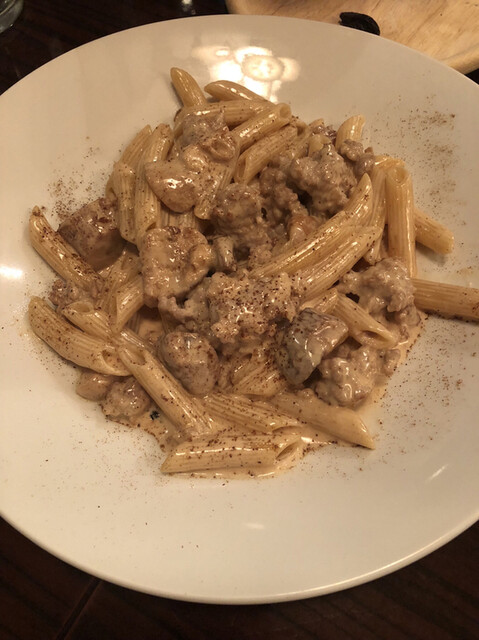 ●フレッシュトリュフのカルボナーラ、ペンネリガーテ:誰だ、こんな悪魔的なパスタを頼んだのは!ワインが進むではないか!トリュフの香りとカルボナーラの濃い旨味が合わさって最高だ。