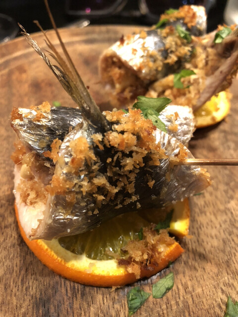 真イワシのパン粉焼きはシチリア風ベッカフィーユ、オレンジ添え。脂が乗ったイワシに柑橘系の酸味と甘みが良い。レーズンと松の実がアクセント。