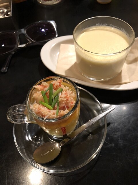 ●新玉ねぎのムースと自家製コンソメジュレ、カニのっけ:まずはこれを頼まなきゃねの逸品‼︎