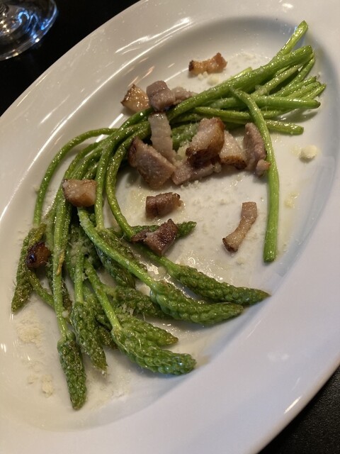 アスパラソバージュと自家製ベーコンのソテー。アスパラソバージュはこの期間しか出回らない、とても希少な食材だ。アスパラガスとは違う種類の植物で、粘り気のある食感と仄かな苦味が楽しい。