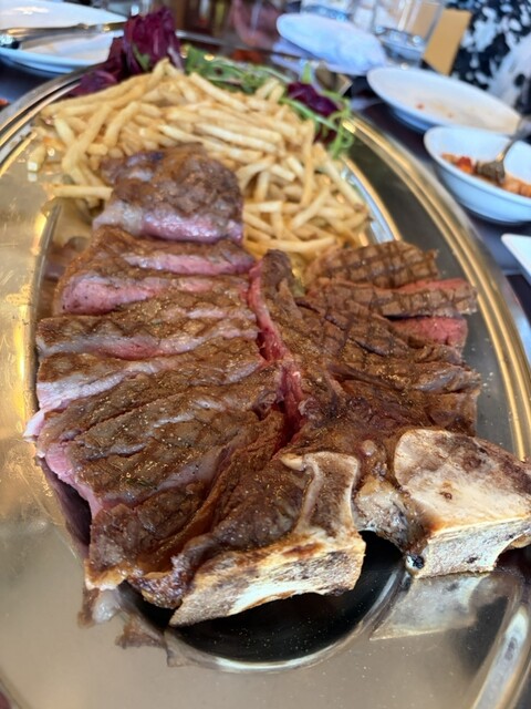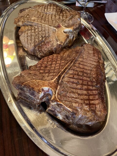 ●本日の主人公ビステッカ3キロ:かなり分厚いので半分に切ってから焼いた方がお勧めだと、事前に上田晃裕オーナーシェフから連絡をいただいていたので、それでお願いしていた。焼き方はミディアムレアかレア位で。これで大正解!肉質自体もとても素晴らしく、焼き加減も最高!一見すると中は生に見えるけど、少し時間が経っても温かい。しかも飲めるように食べ進められる。赤ワインも進むよ!フィレとサーロインを同時に楽しめる贅沢さ。肉料理でこれだけ感動したのは初めてかも知れない。いやぁ、これは凄いや。ご馳走してくれたSさん、上田シェフ、ありがとうございます!