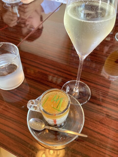 ●冷前菜は新玉ねぎのムースとコンソメジュレ。この日は蟹無しで。うーん、美味しい。
