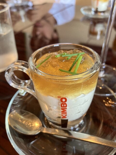 土曜夜の飛び込みディナーは贔屓のイタリアンBarbaroで‼︎ スパークリングワインで乾杯してからの前菜は、上田裕実店長のお勧めで、トウモロコシのムースと自家製コンソメジュレ、雲丹添え。トウモロコシの美味しさが凝縮されて朝美味しい! 上田シェフの得意料理でもあるこの冷前菜のムースは、店の名物として売り出しても良いのでは。