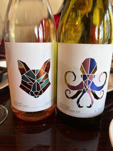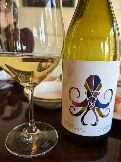 ●白ワイン①:ここでピノ・グリージョが登場。すっきりした酸味と軽やかさ。蛸のエチケットが可愛い。